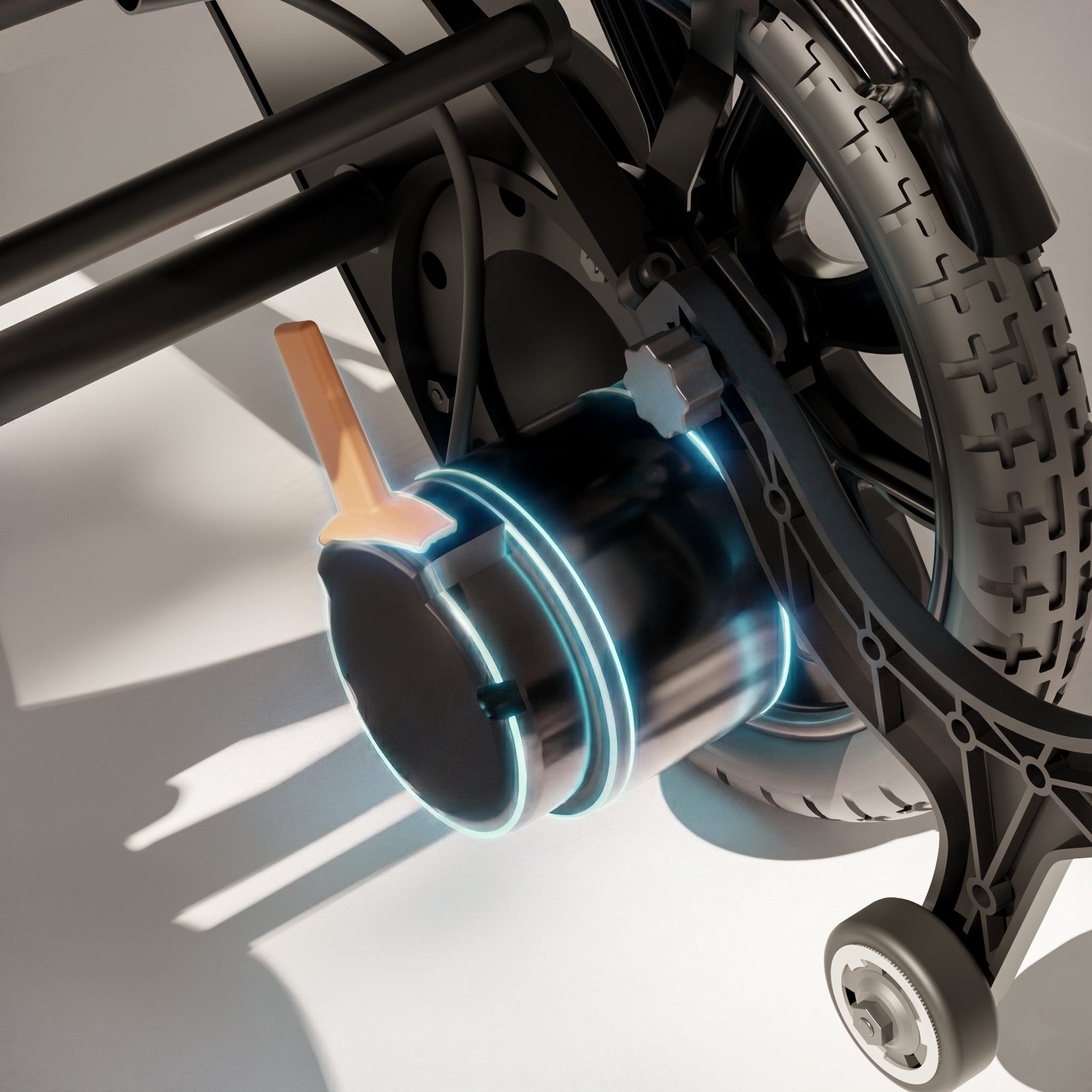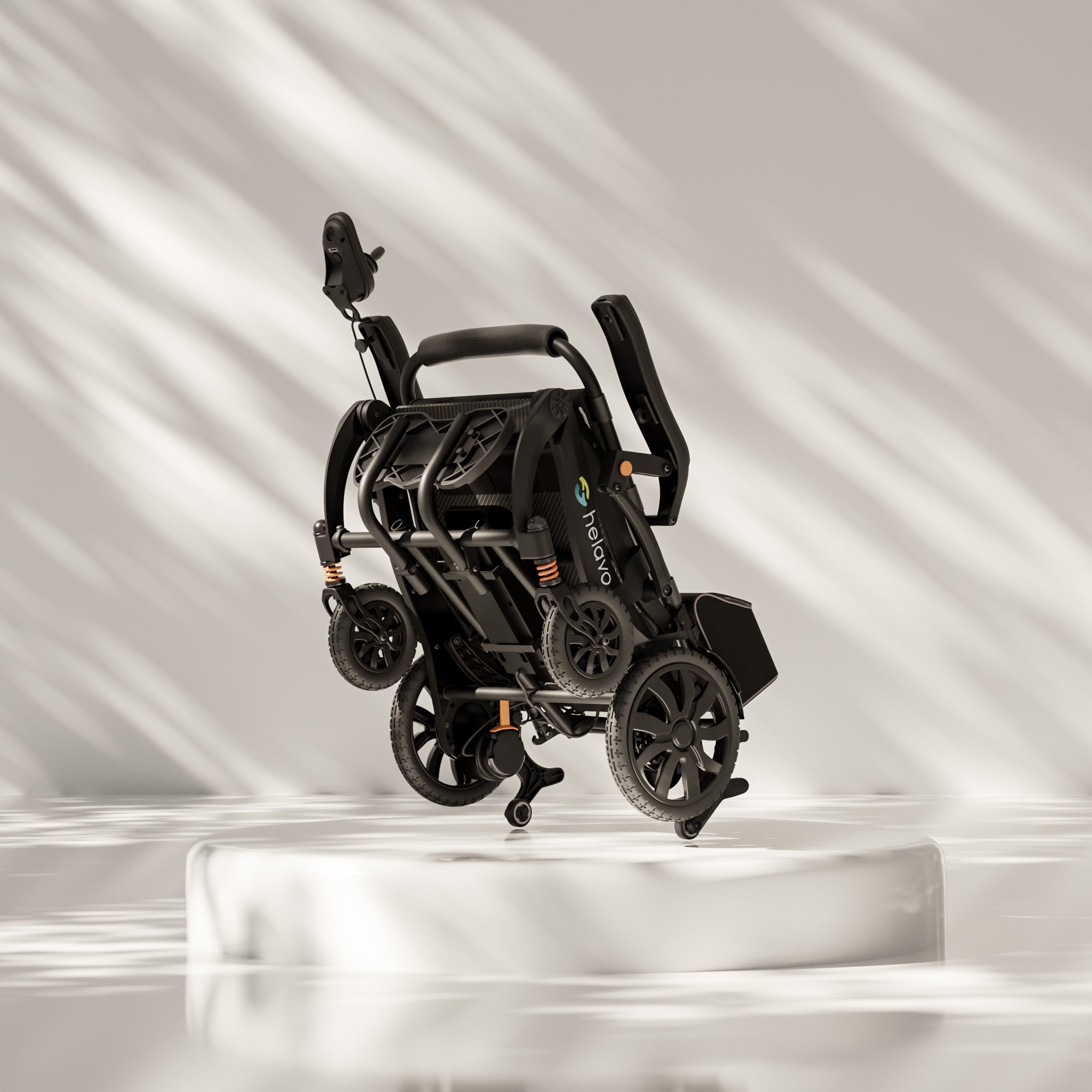 Praktische Funktionen machen den Alltag spürbar einfacher: Der 360°-Joystick mit einstellbarer Geschwindigkeit, Hupe, Stummschaltung und USB-Ladefunktion kann links oder rechts montiert werden. Der Rollstuhl lässt sich in Sekunden zusammenklappen und steht anschließend selbstständig aufrecht – ideal für Transport und Aufbewahrung. Dank Elektro- und Schiebemodus können Pflegepersonen jederzeit unkompliziert unterstützen. Drei integrierte Staufächer halten wichtige Utensilien stets griffbereit.